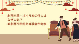 作品マニュアル 劇団四季・オペラ座の怪人はなぜ人気?観劇歴20回超え経験者が考察 劇団四季の『オペラ座の怪人』は、日本三大ミュージカルのひとつで、とても人気がある作品です。そのため、チケット発売日当日は、ネットも電話もつながりにくい状況が当たり前。このチケット争奪には、劇団四季『オペラ座の怪人』初めてさんだけでなく、過去... 2026.04.17 作品マニュアル
